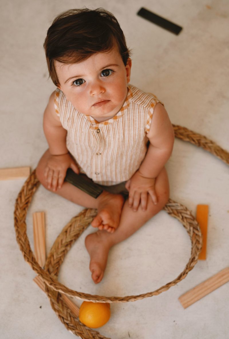 La Combinaison Théo est une pièce pratique et intemporelle pour les tout-petits. Confectionnée en 100% coton doux et respirant, elle séduit par son motif rayée camel au charme classique. Les pressions sur toute la longueur à l’avant facilitent l’habillage et le change, pour un confort optimal au quotidien. Idéale pour la maison comme pour les sorties, cette combinaison allie simplicité, douceur et fonctionnalité.