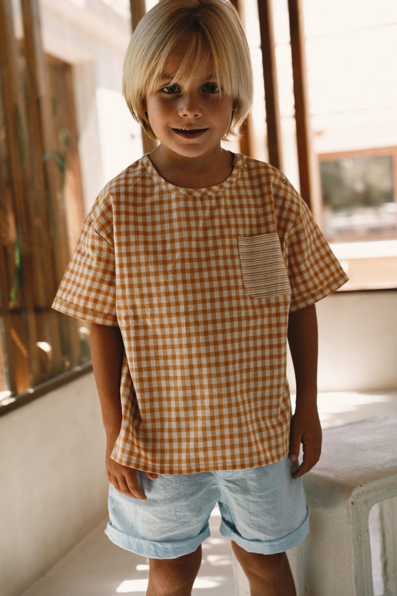 Le tee-shirt Lucas allie confort et style décontracté. Confectionné en coton doux, il présente un imprimé vichy camel moderne et lumineux. Une poche contrastante rayée sur le devant ajoute une touche originale et tendance, parfaite pour sublimer la simplicité du motif.
