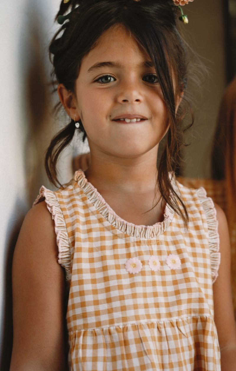 Le top Esther en vichy camel séduit par son allure intemporelle et ses détails faits avec soin. Les trois marguerites brodées à la main apportent une touche poétique et unique, tandis que le petit volant au col et aux épaules souligne délicatement la silhouette. Léger et plein de charme, ce top est parfait pour une tenue douce et élégante au quotidien.
