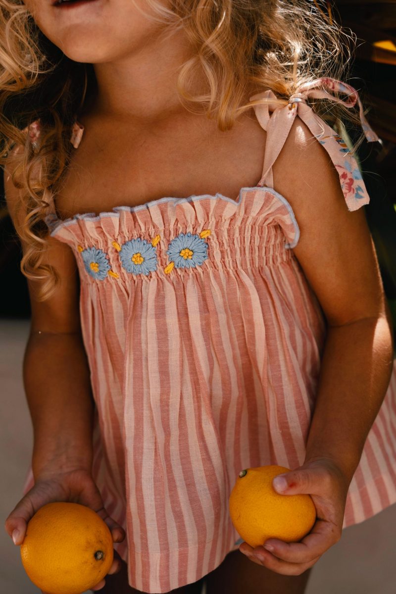 Ce top rose rayé en 100% coton séduit par sa douceur et ses jolis détails. Les trois petites fleurs brodées sur la poitrine apportent une touche poétique, tandis que le petit nœud aux épaules ajoute une note délicate et féminine. Le smock au niveau du buste assure un maintien confortable tout en soulignant la silhouette avec légèreté. Un top plein de charme, parfait pour les journées ensoleillées.